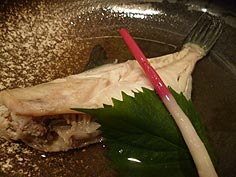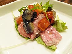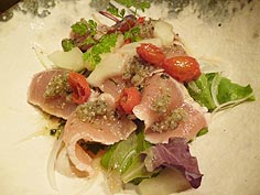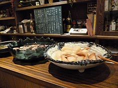 ![]() 突き出し | ![]() カジキマグロの半殺し | ![]() 炙りじゃことほうれん草サラダ |