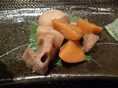 ![]() カウンターの上の大皿料理 | ![]() カワハギの煮つけ | ![]() 前菜の一品 |