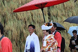 ![]() 花嫁行列 | ![]() 稲刈り作業 | ![]() 水木さんを囲んで記念撮影 |