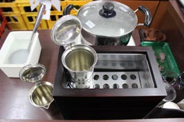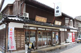![]() 日吉酒造の酒蔵の中 | ![]() 店舗外観 | ![]() 店頭の燗酒器 |