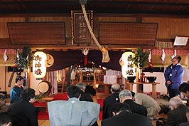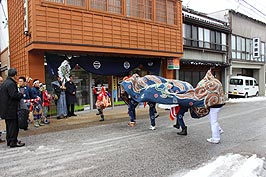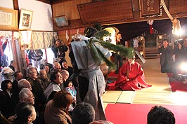 ![]() 神事 | ![]() 門前薬局前での獅子舞い | ![]() 万歳楽土を舞う |