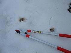 ![]() 荒島もよく見えます | ![]() 並んだ足跡(カメラケースを並べて撮影) | ![]() 新鮮な足跡(太枝切鋏で歩幅を) |