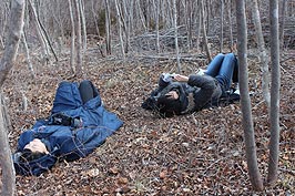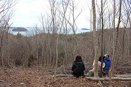 ![]() 切り株をいかして腰かけを作る | ![]() 寝っころがれるようになりました | ![]() 全員で記念写真を |