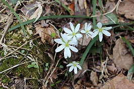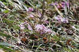 ![]() 白い花の雪割草 | ![]() ピンク色の雪割草 | ![]() 群生している場所がいくつもあります |
