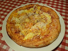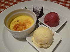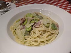 ![]() イル・ピアット・ハタダの半熟卵がのったピザ | ![]() 緑豆を活かしたパスタ | ![]() デザート |