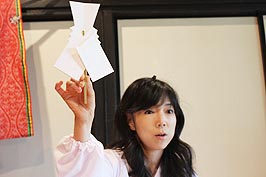 ![]() 工藤真弓さん | ![]() 菅原きえさん | ![]() きりこを作る |