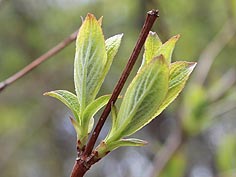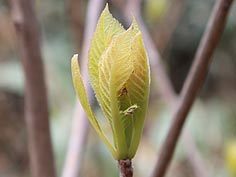 ![]() 新芽、何かな? | ![]() タニウツギの新芽 | ![]() 開らいたタムシバの花 |