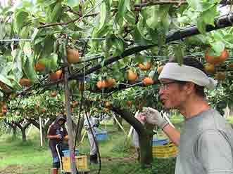 2018年9月16日(日) 梨農業の体験 | ![]() 梨の収穫の仕方を説明する田中組合長 |