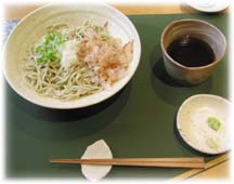 | 11月5日(火) そばの実 午前中、福井で打ち合わせ。その後、近くの「そばの実」という店に行く。福井には、とにかくそば屋さんが多い。ここは家の物置きにしていたようなところを改装して店にした感じである。入り口の右側に石臼が置かれ、カウンターの上には大きなトトロの焼き物が。店内にはカウンターと小上がりがあり、グループ客なども来ていた。そばは白っぽい感じで、少し固めです。おろしそばとかけそばをいただくが、かけにしてちょうどよい固さであった。そば粉100%のそばもあります。場所は福井市大和田のアピタの南側の道路を西に向かっていくと昔の集落に入ってすぐの左側。 | ![]() そばの実のおろしそば |