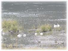 | 11月24日(日) 鴨料理 名古屋からお越しいただいたお客様と加賀に行く。最初、美川で鮭が遡上している様子を見学。釣りの最終日であったが、鮭はたくさん見られた。その後、片野の鴨池へ。観察館には多くのお客さんが訪れており、望遠鏡で鴨を眺める人や、カメラで撮影する人など賑やかであった。しばし、楽しんだ後、大聖寺のばん亭で鴨料理をいただく。メインは鴨鍋。鴨のスモールや天ぷら、串焼きなどもついて、十分楽しめました。 | ![]() 片野の鴨池 |