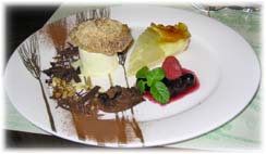 | 11月22日(金) クアガーデン 事務所のスタッフ全員で城端の桜ケ池クアガーデンに宿泊する。クリスマスツリーの点灯式を見た後、レストランで「秋の味覚コース」を試す。厳しい評価をしていただきながら、楽しく食事。こうやっていろんな目で見ると気付くことも多くて、いい機会でした。温泉の露天風呂にゆっくりつかって早々に寝る。睡眠不足が続いていたので、良かったですね。 | ![]() デザート |