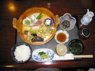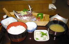 | 6月5日(水) ごちそうさま! 能登島町商工会での広域の事業の打合せの後、民宿せがわ(TEL 0767-84-1022 http://www5.ocn.ne.jp/~segawa/)で刺身定食1300円をいただく。朝、水揚げされた魚を仕入れているとのこと。あじの刺身は美味しかった。向田の信号の角にあるのだが、昼の食事は酒の小売店の裏で提供しているので、ちょっと分かりづらいかも。夜は城端のかねしまでざる豆腐や湯葉のあんかけなどをいただく。こちらも、城端らしいメニューで特長があって美味であった。かねしま(TEL0763-62-0108 http://page.freett.com/kanesima/)は曳山会館の駐車場の続きにある。カウンターや小上がり、お部屋もあって、多用途に使える店です。安心しておすすめできるお食事処の一つだ。 | ![]() せがわの刺身定食 |