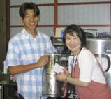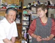 | 6月24日(月) 安心院へ フローラハウスで手作りの美味しい朝食をいただく。玉の湯の駐車場に車をとめさせていただいて、周辺を散策する。雨の中を「アトリエとき」までぶらぶら歩く。月曜日ですので、お客様はちらほら。11時からは玉の湯で桑野和泉さんとお話しする。いつも、明るく爽やかな印象を与えて下さる方です。今度は由布院のみなさんに城端にお越しいただこう。由布院駅に途中で帰られる今井さん、藤田さんを送り、「ねんりん」で昼食。午後は由布院の隣の安心院(あじむ)へ行く。役場のグリーンツーリズム推進係の河野洋一さんに案内いただいて、町を見て回る。直売場がたくさんあったが、どこもお客さんをしっかり集めているようです。夜は農泊のひとつ、中山ミヤ子さんのところでお世話になる。囲炉裏端で、楽しくお話をしながら、食事を延々いただく。最後は亀の井ホテルの温泉に行く。 | ![]() 中山さん御夫妻 |