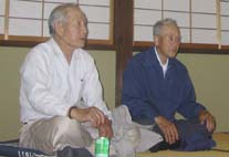 | 6月17日(月) 本木という地区 夜は能都町の本木地区で古老にお話をうかがう。最初に八幡神社を見に行くが、100段の階段の下に用水があり、その周囲には蛍が舞っていた。社叢林のシルエットの上に月が浮かび幻想的な光景であった。社の中には9体の神様が安置され、珍しいものを拝見させていただきました。真ん中に本社の八幡神社があり、両サイドに4社づつ並んでいます。昔は集落ごとにあった神社をまとめたためとのことですが、バランスが悪いので、静岡から秋葉神社を招いたとのこと。一見の価値のあるお社です。一通りのお話をうかがった後、若い衆と一緒になったが、地区の名前の由来についても、良く知らない方もおり、家庭以外での交流の場が必要であることがよく分かる。さらに必要なのは、他所者と一緒に地区を見て回ることではないか。 | ![]() 山崎さん、小杉さん |