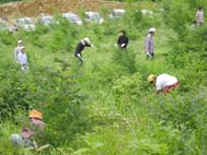 | 6月30日(日) 石川の森づくり2002夏 白峰村での森づくりに参加。今回は草刈りである。過去3年間にわたり植えてきた、ぶなやみずならなどの植えてあるところで草を刈る。随分太くなっている木もあれば、雪で寝てしまっているけやきなどもたくさんある。お世話が必要な訳です。家族連れから若い人や年輩の人など、多様な方々にご参加いただきました。昼前に終わり、展望の湯に入る。その前に竹商店でとちもちを買う。竹睦子さんも元気に仕事をされていました。魅力的な人です。 | ![]() 草を刈る |