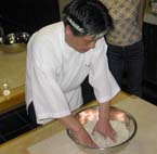| 6月29日(土) さくらんぼ狩り 朝から、市内を案内いただく。最初にマウンテンファームの山川喜市さんのお話をうかがう。美味しいヨーグルトのソフトクリームを御馳走になり、牧場の柵のところで、お邪魔したメンバー8人が手をつなぎ、電気を感じる。肩の力が抜ける感じであった。酪農体験を楽しませてくださるところでもある。やぎやロバ、うさぎ、にわとりなどいろんな生き物が共存している。次に、念願のさくらんぼ狩を体験。佐藤錦、ナポレオン、高砂などをお腹いっぱいになるまで食べる。楢下宿の街並や建物を見学した後、蒟蒻番所で昼食。こんにゃくのコース料理をいただき、ご主人のお話をうかがう。午後はまちづくり塾スペシャルセミナー、交流会とつづく。交流会はみつひろで行われたが、そば打ちの見学と体験もさせていただく。夜8時には出発し、金沢には2時前に着く。 | ![]() そば打ち実演 |