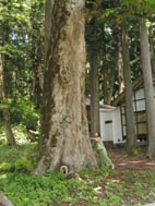 | 6月19日(水) トチノキの大木 石川・白山郷ブロック商工会女性部の事業で吉野谷村を見て回る。中宮のとうふ料理・むらうちで、とうふづくしをいただく。山菜も含まれていて、山らしい食事であった。一番最初に見学したのは、むらうちから歩いて行った笥笠(けがさ)中宮神社。境内に大きなトチノキが立っていて、見事でした。時の流れを感じさせてくれる樹です。写真に小さく写っているのは白峰村でとちもちを作っている竹睦子さん。似合っていますね。その後、加賀藩・天領境界の関所跡、仏御前安産石、佐羅早松神社、工芸の里、手取峡谷を見て回る。工芸の里の御仏供杉(おぼけすぎ)や佐羅早松神社の杉林など、魅力的な空間がたくさんあります。普段、なにげなく通り過ぎていますが、あらためて拝見すると気付くことも多い。 | ![]() 笥笠中宮神社のトチノキ |