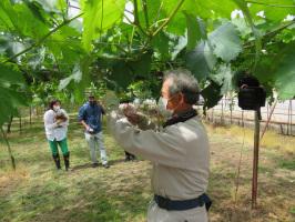 9時半までに宝達志水町の暮らし体験の家へ行き、滞在中の移住希望親子と面談。その後、ルアーを制作販売されているハッサク工房にお邪魔し、市村さんと話をしていただきました。参考になる話をいろいろしていただけました。自炊されるとのことでしたので、我々はなぎさ亭で昼食。満席状態でした。昼休みに町役場で税金を支払う。午後は、網ぶどう園で、網さんと小早川さんと話をしていただきました。動画の撮影の様子も拝見したので、作業の動画制作のためのポイントもつかむことができました。その後、千里浜を紹介し、集合住宅や空き家を紹介。おばちゃんちにもお邪魔して、中町さんとお話をしていただきました。歴史好きの移住希望者さんのために、埋蔵文化財センターにも案内、いろいろ説明をしていただきました。昔は、能登、加賀、越中をつなぐ要衝だったことがうかがえる展示内容でした。夕方には、暮らし体験の家に戻り、お母さんも交えて話をさせていただき、我々は帰る。 | ![]() 網ぶどう園で |