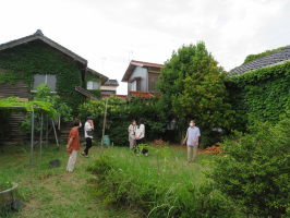 午前は宝達志水町上田出の家でチップ化作業を行い、裏庭の道路際の駐車スペースに撒く。11時には、近所の建設会社さんにお越しいただき、改修の見積をお願いしました。その後、納屋の周りの草などをとる。少しは見やすくなりました。壁面に伸びていたツタも外すことができました。郵便局や銀行を回った後、暮らし体験の家に行き、移住体験にお越しだった夫妻を金沢駅まで送る。事務スペースがあり、仕事もしやすかったとおほめいただきました。再訪を期待していよう。金沢に戻ってから、昨日オンライン相談した方と来訪スケジュールについて確認。月末にお越しいただくことになりました。動きが早い人は対応しやすいですね。 | ![]() 草刈りした場所にチップを撒く |