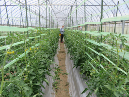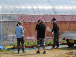 本日も朝8時過ぎに農業体験希望者さんが住まう金沢のアパートに迎えに行き、河北潟干拓地へ。今日はハウスでトマトを栽培している井上さんにお世話になりました。昨日の谷内さんと同じく耕杜のメンバー。頑丈に建てられたビニールハウスで、トマトを中心にネギや金時草なども栽培されています。本日は、トマトの誘引と受粉作業を体験させていただく。見ているだけでは手持無沙汰だったので、芽かきや草取りを手伝うが、結構な仕事量でした。ハウスから出ると風が心地よく、広々とした干拓地の風景も魅力的でした。午後は、西部プールで歩く。 | ![]() 河北潟干拓地で |