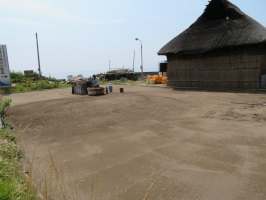 朝6時半過ぎに農業体験を繰り返している方を迎えに行き、宝達志水町の暮らし体験の家へ。置いてある車を使っていただくことにして、先導して羽咋の谷内さんの家に案内する。その後、一旦上田出の家で時間調整。9時には暮らし体験の家に再度行き、東京の曹洞宗のお寺で座禅を組んでおられる移住体験者さんを門前の総持寺租院に案内する。一通り見学してまわり、次に輪島へ。11時半ぐらいに着いたので、朝市を見て回っていただきました。車で白藤酒造に行き、女将さんと話していただき、珍しいお酒を購入されていました。東京でたまたま入った居酒屋で勧められて飲まれたことがあったとのことです。千枚田をご覧いただき、曽々木のとねで昼食。午後は、角花さんの塩田を見学。汐撒きを見せていただきました。貴重な塩を買わせていただく。海沿いを北上し、つばき茶屋で休憩。狼煙の道の駅に車を置いて、禄剛崎の灯台まで歩く。さらに海沿いを南下、不思議なゾーンも少しご覧いただいた後、須須神社を紹介。ゆるやかいにカーブした参道脇にたつツバキやケヤキ、タブなどに感動いただく。飯田まで海沿いを走り、宝達志水町に戻るが、途中、羽咋のアダチストアで買い物をしていただくが、地物が多いと喜んでいただきました。 | ![]() 角花さんの塩田 |