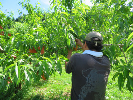 朝9時には宝達志水町の暮らし体験の家に行き、移住希望夫妻の案内をスタッフに頼み、自身は待機。11時過ぎには、視察にお越しになった加賀市の方々を出迎え、建物内を案内。上田出の家にも移動し、中をご覧いただきました。午後2時半には、免田駅に新たな移住希望者がお越しになったので、町内を案内。まずは東間の紋平柿畑で地域おこし協力隊の小早川さんと話してもらう。山崎のトトロを紹介した後、金曽農園へ。桃に袋かけをされている様子を拝見しながら、少し話をうかがう。次に網ぶどう園でぶどうの様子を拝見。最後に、松浦さんのイチジク畑で枝を吊る作業の様子を拝見しつつ、お話をうかがう。実に入った虫の痕を発見するのが難しいとのことでした。いい課題をいただきました。上田出の家に入ってもらい、スーパーのちゃれんじまで買い物に出かけ、後は自由に過ごしてもらうことにして、私は暮らし体験の家へ。移住体験中のご夫妻が戻ってきておられたので、明日の予定を確認して、解散とさせていただきました。 | ![]() 金曽農園で |