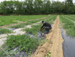 朝8時過ぎに農業体験希望者さんが住まう金沢のアパートに迎えに行き、羽咋へ。道の駅のと千里浜でお世話になる谷内さんと合流。まずは、先輩のスイカ畑で説明をしていただき、次に谷内さんの管理されている畑を見せていただく。納品があるとのことで、自宅でネギの袋詰めの体験をさせていただき、納品に同行。納品先が東京から移住してきて自然農の取り組む水野さんのご自宅でした。いろんな苗を育てておられ、苗の販売もされているとのことでした。多くはYouTubeで販売されているとのこと。ヨモギの苗も販売されていて、発想が違います。その後、スイカ畑に戻り、大きくなり始めたスイカの実を選別しつつ、棒を立てる作業を体験させていただきました。農業希望者さんにとって、よい経験でしたね。金沢までお送りして、当方は宝達志水町の暮らし体験の家に戻り、洗濯を開始。途中、上田出の家にも行き、買い物をして戻る。2名分のシーツ類の洗濯が終わった段階で、コインランドリーで乾燥に。次の洗濯を終えて、コインランドリーで再度乾燥させに行き、最初のシーツ類を持ち帰ると、ちょうど、移住体験のご夫妻が到着でした。しばらく、今井さんと話をして、早々に帰る。 | ![]() 谷内さんのスイカ畑での体験 |