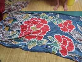 朝6時半には宝達志水町に行き、上田出の家に置いてあったゴミを出す。その後、能登の何人かの方々に電話でヒアリング。午前は、上田出の家の草刈り。中途半端に終わりましたが、続きは明日にでもできればと思う。午後2時からは、宝達志水町に移住された玉作栄一さんを取材。獅子舞の胴の部分の蚊帳や幟、法被などなんでも染めるものならおつくりになっているようです。金沢の郊外から宝達志水町小川に工房に使える車庫付き物件を購入され、大幅に改修されて、仕事をされています。新聞などでも取り上げられたので、能登各地から注文が入っていて忙しく仕事をされています。ダイニングからは、七尾線の電車や宝達山が見える好立地です。近所の方ともよい関係を作られていて、近くの高齢者施設でも、染物などの展示を定期的にされています。 | ![]() 玉作さんのご自宅で |