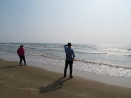 9時35分小松空港着の飛行機で来訪された移住体験夫妻を出迎え、金沢に案内。まずは、21世紀美術館の駐車場に車を入れて、21世紀美術館を案内。無料ゾーンを一回り。その後は兼六園へ。瓢池、噴水、ことじ灯籠、唐崎松、霞ケ池等をご覧いただく。昼食は中央卸売市場前の寿司屋でいただきました。行列ができていてしばらく待ちましたが、海鮮ちらしをご馳走になりました。午後は、東茶屋街をぶらぶらし、最後に近江町市場を見て回る。河北潟干拓地の夢ミルク館でソフトクリームを試してもらい、宝達志水町へ。千里浜なぎさドライブウエイを最初から最後まで走り、暮らし体験の家へ。温泉やスーパーなどを紹介して、後は車を使っていただくことにしました。 | ![]() 千里浜で |