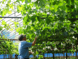 午前9時には宝達志水町の暮らし体験の家に行き、網ぶどう園に移住希望者さんを案内。網さんの熟練の作業を拝見しつつ、小早川さんと話してもらう。その後、羽咋の谷内さんのスイカ畑へ。出荷に行かれたとのことでしたので、金曽農園に行き、息子さんから少しお話をうかがう。再度、谷内さんの畑に戻り、少し話をうかがうことができました。その後、松浦さんのイチジク畑で少し話をうかがい、山崎集落の裏山の紋平柿畑を紹介。最後はなぎさ亭で昼をいただき、見送る。金沢にもどり、法務局に行った後、近くの西部プールで歩く。夕方にはドコモで、スマホ購入の事前説明を受け、再度月曜日に訪問することに。 | ![]() 網さんの仕事の様子 |