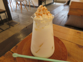 朝9時には山代温泉の温泉ぐらしの家に行き、滞在中の親子と市内めぐり。まずは山中温泉へ。あやとり橋の真ん中から渓谷を見下ろし、菅谷を走り、栢野の大杉を拝見。大杉茶屋は臨時休業で、14日までお休みと掲示されていました。次に、こおろぎ橋や我戸幹男商店、山中座、松浦酒造などを見学。東谷にも案内、更谷工房ものぞくがお休みのようでした。平松牧場で手づくりアイスを試してもらい、片山津温泉の総湯を紹介し、中谷宇吉郎雪の科学館にも立ち寄る。かぼちゃ村のアレコレで昼食。橋立海水浴場、橋立漁港、まるや水産、日菓、小さな公園、加佐の岬にも行ってみる。片野海岸を眺め、加賀フルーツランドも見学した後、大聖寺へ。フゾンで休憩し、山根さんを紹介させていただきました。その後、山の文化館も見学。かりぐらしの家に立ち寄り、中をご覧いただく。会社の軽自動車に乗ってもらい、先導して温泉ぐらしの家に戻る。宝達志水町に移動し、暮らし体験の家で移住体験者を受け入れる。 | ![]() フゾンのジンジャーミルク |