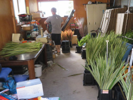 昼前に宝達志水町の上田出の家に行き、滞在の準備。午後2時過ぎには、千里浜ドライビングスクールに行き、本日卒業した移住希望者さんを迎え、今後の希望をうかがい、花木の畑を見に行く。午後3時には役場の農林課に行き相談。すぐに花木栽培に取り組む農家さんに話をうかがいに。脱サラで花木の栽培に取り組まれています。通年で安定して仕事があるようです。自然の影響も受けそうですが、いろいろな種類を栽培することで、危険分散は可能そうでした。植えてから3年は出荷までかかるとのことです。当座の売上を上げるために、塗装枝の生産出荷もされているとのこと。花材になりそうなものを新たに開発していくことの可能そうです。面白いものに注目してくださいます。スーパーで買い物をしてもらい、上田出の家に送り泊まっていただく。 | ![]() 花木の出荷作業現場 |