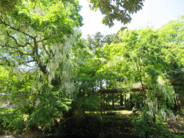 午前は加賀市の交流センターさくらの3階に新たに整備されたテレワーク拠点を見学させていただきました。スペースが拡大されて、インキュベーション用の部屋も10部屋追加されており、テレワーク用の個室やミーティングルームもあります。その後、近所の江沼神社を見学に。池の中を通ったのは数十年振りのことです。小学校の頃には頻繁に遊びにきていた場所です。池の中に島があり、橋がかかっていて島を通ることができます。昔と同じく亀が何匹も住んでいました。ちょうど白藤がきれいに咲いています。昼は加賀温泉近くのJA近くにあるお食事処でいただく。初めて入りましたが、大勢のお客様がお越しで満席状態でした。午後は野々市市の病院まで面会に行き、その後能美市に戻るが、少し時間があったので、小舞子の叔母の家に立ち寄り、郵便物をチェック。お隣の家との間に生えていた木を除伐し、庭木の道路にはみ出している部分をカット。夕方4時からは能美暮らしの家・大成で移住者さんとの相談に同席。 | ![]() 江沼神社の白藤 |
