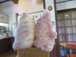 朝8時には、かりぐらしの家を出発。奥谷の梨園を回り、南の坂道を上がると片山津カントリ倶楽部のゴルフ場に抜けました。吉崎御坊、塩屋海岸、久保田さんのトマトハウス、加賀フルーツランド、片山津温泉の総湯と回り、平松牧場へ。生きものたちと触れ合い、手づくりアイスをいただく。次に打越の製茶場を訪ね、お茶を購入、茶畑も見学。次に能美の西田さんの畑を見学。金沢駅に向かう途中、寿司食いねぇ!で早めの昼食。金沢駅に移住希望者を送り届け、移住相談員さんと北上。千里浜なぎさドライブウェイを走り、千里浜レストハウスを見学。SSTRの参加者のバイクが多くとまり、店内にも多くのバイカーがいらっしゃいました。道の駅のと千里浜を見学の後、宝達志水町の暮らし体験の家をお教えし、直売所で買い物、上田出の家も見学いただく。里山カフェそらいろのたねにお邪魔して休憩、青江夫妻にご紹介。東間の宝達山への登山口や柿畑も紹介した後、金沢駅にお送りして、サポート終了。 | ![]() 平松牧場の手づくりアイス |