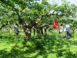 11時前には加賀に行き、温泉ぐらしの家を確認した後、スタッフを伴い加賀温泉駅へ。11時半過ぎに到着した大阪からの移住希望者さんを出迎え、山代温泉に案内。まずは漁火で昼食。午後は東谷・今立の辻邸にお邪魔してお話をうかがう。本日はご主人だけでしたが、農的暮らしを希望されている移住希望者さんにはぴったりの話でした。その後は、奥谷の梨園に行き、関西から移住されてきている3組の方々にお話をうかがう。お世話いただいている田中さんからも話をうかがうが、摘果のポイントをうかがえました。大聖寺のかりぐらしの家もご紹介し、山代温泉に戻る。その後はご自身でまちを歩いてみるとのことでしたので、早々に金沢に戻る。 | ![]() 奥谷の梨園で |