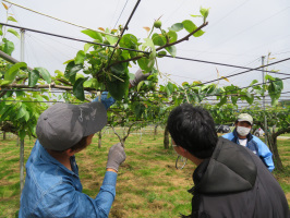朝8時半には能美暮らしの家・和気に行き、滞在中の移住相談員の田口さんを里山エリアから里海エリアまで案内。仏大寺集落を紹介、坪野の茶楽さんでお話をうかがい、火釜の安田さんの炭窯の様子を拝見に行ったら、その奥に登り窯と住まいを作られている方とお話できました。辰口温泉を通り、大成の家も紹介、日本海まで参りました。金沢駅11:52着の新幹線でお越しになった移住希望者さんを出迎えに行き、一緒に加賀に移動。小塩辻の梨園で、摘果作業を体験させていただく。習熟するには、それなりの年数経験を積まないといけなさそうです。基本的な要領を最初に教えていただき、さらに経験を積まれている後継者に見本を示していただき、その上で実際に摘果ハサミで切る体験をさせていただく。どれを残すかを見極めるのが難しそうでした。終了後、山代温泉の総湯に入り、大聖寺で夕食。夜の町も歩き、重佐と白山でお世話になりました。 | ![]() 小塩辻の梨園で摘果作業体験 |