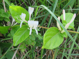 午前は宝達志水町に行き、移住体験中だった方のチェックアウトに立ち会う。その前に千里浜の様子を見に行くが、海浜植物の花が咲いていて楽しめます。砂浜近くには、ハマエンドウ、ハマヒルガオなどがたくさん咲いています。道路際には、シャリンバイ、ノイバラ、スイカズラなども咲いています。移住希望者さんを見送り、すぐに金沢に戻り、午後はプールで歩いた後、県庁へ。地域おこし協力隊の面接に立ち会う。いろいろ質問をさせていただきました。県内部で検討され採否が決定される予定です。 | ![]() スイカズラ |