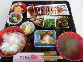 大きな地震から1週間。曽々木側から八世乃洞門(はせのどうもん)新トンネルを抜けて真浦に入り、見附島までを見て回る。角花さんの塩田で話をうかがい、つばき茶屋で昼をいただく。長谷川(志保石)さんの家を訪ね話をうかがう。狼煙の道の駅は大きく傷んでいるようで休業中でした。岡田の皆口さんと立ち話、ご自宅の屋根が傷んでいました。蛸島の櫻田酒造でお酒を買わせていただくが、建物や瓦が傷んでおり、要注意の判定の紙が貼りだされていました。すえひろでも話をうかがうが、それぞれ被災した場所がおありとのこと。飯田の商店街を通り、シーサイドと飯田港の様子も確認。レストラン浜中さんは休業中でした。最後に見附島の様子を見に行く。先端部が相当崩れていますが、多くの観光客がお越しでした。見附茶屋は営業中。滝見亭、庄屋の館、こだま、二三味珈琲、古川商店、いろは書店、山口陶器店、多間本家、多間栄聞堂、泉谷菓子舗、シュークルグラス、メルヘン日進堂、道の駅奥能登塩田村、道の駅すずなり、今井商店、ギフト館イマイ、まつうらなど、多くのお店も営業中です。お邪魔できなかったですが、ギャラリー舟あそびも企画展をされています(FBより転載)。その後、能登事務所に立ち寄り、鉢伏山の頂上エリアにも行ってみましたが、途中に倒木がありましたが、のこぎりで大きな枝を切り、車が通れるようにして行くことができました。帰りに宝達志水町の上田出の家により、精算金を渡すが、庭に面した場所に、ウッドデッキができていました。 | ![]() つばき茶屋でいただいたいかさま定食 |