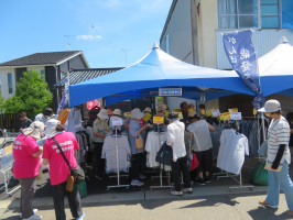 朝9時前に宝達志水町の暮らし体験の家に行き、滞在中の移住体験者さんと一緒に穴水へ。10時前には到着。のと里山海道が双方向で通行できるようになって初めて通りましたが、スムーズでした。迂回路やアップダウンが激しいところはありますが、車の絶対数が少ないようで、渋滞はありませんでした。穴水町では駅前に車をとめさせていただき、駅前や商店街で行われているイベントを見学。店が倒壊した衣料品店・バルこばやしさんのテントには大勢のお客様がお越しでした。全国から応援自治体の出店コーナーもあり、賑やかでした。商工会女性部はなあげそうけせんべいを販売、舞谷部長が積極的にPRされていました。イベントコーナーから外れた場所にある加藤靴店は跡形もなくなっていました。天気が良すぎて暑くなってきたので、早々に会場をあとにして、海沿いを南下して戻る。羽咋にすしべんで昼食をいただくが、12時近かったので満席状態でした。その後、金曽農園にお邪魔して桃を買わせていただく。イチョウ並木を見学した後、敷浪の家に一旦戻り休憩。地域おこし協力隊の池田さんが来てくれたので、一緒に千里浜へ。網ぶどう園、坂本ぶどう園、羽咋のスイカ畑ゾーンを案内した後、千里浜の道の駅へ。千里浜なぎさドライブウエイが一部だけ走行可能になっていたので、そこだけ走り、レストハウスにも入ってから戻る。 | ![]() 穴水町で |