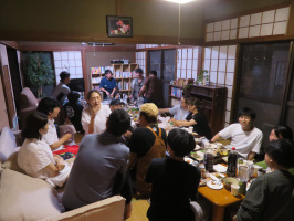 昼にはいしかわ総合スポーツセンターのプールで歩く。久しぶりです。夕方18時から、宝達志水町のおばちゃんちで、宝達志水町の移住者交流会。20名以上の方が集まりました。ごく最近移住された方も含め、いろんな方がお越しです。役場の移住担当や地域おこし協力隊も全て参加でした。おばちゃんちで料理をいろいろ用意いただき、おむすびはみんなで作りました。おっSAMAのオードブルやお刺身は注文いただいたものが並び盛りだくさんでした。飲み物は、持ち寄りで、一番新しい移住者さんがワインを何本もお持ちいただき、皆さんの振舞っていただきましたが、ソムリエの資格もお持ちです。今後も継続的に開催できればと思いますね。 | ![]() 移住者交流会の様子 |