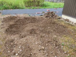 午前10時前に能美市和気の地域体験の家に行き、スタッフを待つ。加賀に置いてあった軽自動車に乗ってきてもらいました。週末お越しになる東洋大の先生に利用いただければと考えております。一緒に加賀に行き、かりぐらしの家に滞在中の移住予定者さんと話をさせていただく。29日には契約した住まいに入られるとのことでしたので、それまではかりぐらしに家と温泉ぐらいしの家に滞在いただくことにさせていただく。昼はパスタをご馳走になり、午後は再度能美市和気の能美ぐらしの家で、庭のウド掘りを行う。これで、一通りの株を掘り出したことになります。 | ![]() ウドを掘った跡 |