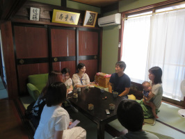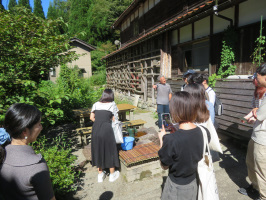 本日も朝9時前に山中温泉の旅館に行き、中央大学の学生諸君を連れて、東谷の今立へ。集落の一番下にある駐車場から2手に分かれて集落を歩くということで活動。当方が案内したグループは、最初の家、移住者の近藤さんが住まう家をピンポーンしたら、ちょうどおられたので、畑や民宿にする予定の家の中も見学させてもらう。さらに家の中でお話もうかがうことができました。11時近くまでお世話になり、ここで終了。別のチームは集落を一通り歩いたようで、何人かの人に話をうかがえたようで何よりです。フィールドワークらしい活動になりました。加賀温泉駅まで送り届け、全てのサポートを終了。元気村で梨とぶどうを買って戻る。途中、能美市の大成の家に寄り、打合せ。叔母の家にも寄り、郵便物をピックアップ。家に戻り、早めに夕食を作り、早く寝る。さすがに疲れました。 | ![]() 今立で近藤さんからお話をうかがう |