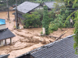 能登に出かけるつもりであったが、天気予報に従い、金沢にとどまっていたら、能登は朝からひどい雨降りで、大雨特別警報が珠洲市、輪島市、能登町に発令されました。能登のスタッフからも、能登事務所近くがひどいことになっていると、写真が送られてきました。能登の知人たちのFBなどをチェックしてみても、多くの地点で洪水が発生しているようでした。奥能登に行くのは無理でしたね。 | ![]() 能登事務所近くの写真 |