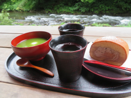朝7時過ぎに山中温泉のゆざや市へ行く。穴水町商工会の方々がお越しになっているとのことでした。なあげそうけ煎餅やストラップなどを販売。9時半にはかりぐらしの家に行き、インターンシップの学生さんを連れて地域案内。まずは三谷の2つの温泉を見学に。日谷町共同浴場では、関係者がおられたので中を見学させていただきました。山中温泉に移動し、あやとり橋から鶴仙渓に下り川床でスイーツをいただく。途中から森の中を歩き、こおろぎ橋を渡り戻る。我戸幹男商店で買い物、加賀依緑園を見学。菅谷の山ぼうしでそばをいただき、栢野の大杉を拝み見て、大杉茶屋で草団子を購入。杉水のマグノリで飲み物をいただくが、大土の二枚田さんがお越しでした。県民の森に立ち寄った後、今立の辻邸に久しぶりにお邪魔してお話をうかがう。さらに、うずりん堂でご主人夫妻と話をさせていただく。大聖寺に戻り、マルエーで買い物をしてもらい、かりぐらしの家まで送り届けて本日のサポートは終了。 | ![]() 川床でいただいたスイーツ |