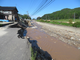 朝早くに金沢を出て能登へ。まずは能登事務所の確認に行くが、事務所のある当目地区に入ると、道路に土砂が流れ出しているとことがありました。水田にも、土砂が入り、水の勢いで稲が倒れてしまっています。事務所は電気は来ていますが、水道は断水したままでした。柳田の中心部に向かう道は土砂崩れで、復旧工事の最中で通れなくなっていました。仕方ないので、珠洲道路を通り、復旧工事現場の向こう側にいったら、1ケ所だけが通れないようでした。次に珠洲に向かう。早めに着いたので、すず食堂でランチをいただく。ボランティアの学生さんとスタッフたちもやってきました。早めの昼食後、当方は、皆口さんの様子を見に行くが、作業小屋の前の川の水があふれ、農業用の機械類も水に浸り、後片付けに追われていました。自宅は大丈夫だったとのことですが、大きな痛手です。田んぼの稲刈りもほとんど終えていないとのことで、その被害も大きそうです。さらに先端を目指して、東山中を抜け、折戸の出て、狼煙の道の駅、川浦の知人の家、つばき茶屋、高屋を抜けて海沿いを走りましたが、通称ゴジラ岩の手前で、道路に土砂や木が流れ出している地点があり、通行不能に。珠洲の中心部に戻り、すえひろでの片付け作業を拝見。NHKスタッフが取材に来たので、大谷を目指して山の中を行くが、集落の手前で道路が無くなっていました。仕方なく中心部に戻る。やなぎだ荘で温泉に入り、能登事務所に泊まる。 | ![]() 大谷集落手前で道が崩落 |
