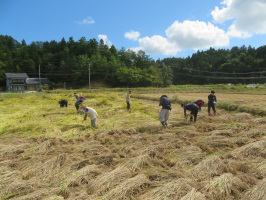 朝6時過ぎに家を出て、能登へ。金沢市内で、能登への移住希望者さんをピックアップ、穴水のすしべんで朝食を食べて、珠洲を目指す。正院町岡田の集会所で、神戸学院大の学生さんの到着を待つ。皆口さんの田んぼで稲刈りの手伝いを行う。9月の豪雨で川が溢れ、水田に土砂入ったところはコンバインで稲刈りができません。故障してしまうおそれがあるため、手刈りして、土などを落としてコンバインにかけます。しばらく水に浸かっていた稲や重なって湿った状態が続いた稲穂からは芽が出てしまっています。それらも可能な限りはぶきながらまとめていきます。神戸学院大8名、ぶなの森2名、移住希望者1名、みなくち農園2名で作業を行い、夕方4時過ぎに田んぼ1枚を刈り終えました。すでに皆口さんの奥様などが刈っておられた田んぼに入っての作業でした。端の土砂に埋もれている部分はそのままですが。明日は、別の田んぼで作業の予定です。終了後、移住希望者さんを穴水駅まで送り、柳田に戻り、やなぎだ荘の温泉に入り、能登事務所に戻る。 | ![]() 皆口さんの田んぼで稲刈り |