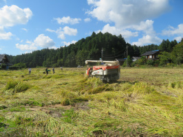 本日も珠洲市のみなくち農園で稲刈りのお手伝い。朝7時半前に能登事務所を出て穴水のすしべんへ。朝食をいただいた後、注文してあった弁当を購入し珠洲に向かう。本日も車が多い。昨日も利用させていただいた岡田集会所に弁当を持ちこみ、神戸学院大の学生諸君の到着を待つが、すでに作業をされていたので、稲刈りのお手伝い開始。ただし、本日は集会所の前に田んぼでの作業でしたが、稲が立っている部分が何割かあったので、その中に生えている草を取り除き、コンバインで稲刈りを行うための準備作業を最初に行う。次に倒れている稲の中でも芽が出ていないものを刈り取り、畔などに積み上げる。早めにコンバインが到着し、稲刈りがスタート。午前中で刈り取れる部分は刈り終えていました。早めの昼食を集会所でいただき、本日のボランティア活動を終了。集会所をきれいに掃除してもらい、長靴を川で洗ってもらう。水道が断水している地区もあるとのことで防災無線で節水の呼びかけが行われていました。1時過ぎには学生諸君を見送り、すえひろさんにお邪魔する。小原さん夫妻がボランティアのためにお越しで、しばらく茶飲み話。少しだけ片付けを手伝い、金沢に戻る。 | ![]() コンバインでの稲刈り |