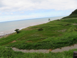 朝6時に金沢駅に到着した大阪工業大学の学生さん4名を能登に案内する。まずは千枚田を目指す。途中、西山で休憩、穴水のすしべんで朝食。千枚田までは前回よりもスムーズでした。道路に堆積していた土砂がほとんど撤去されていて、走りやすかったです。千枚田では、歩いて一番下まで行ってみました。何箇所も崩落したり、土砂が田んぼに入っていたりで、修復に時間がかかりそうです。今年植えた田んぼは稲刈りも終わっていたようでした。道の駅のトイレは使えるようになっています。次に輪島市内に戻り、朝市通りの周辺を歩いてみて回る。わいち商店街を走っていたら、中浦さんを見かけたので、えがらまんじゅうを売っている店で、まんじゅうを食べてもらい、少し話をうかがう。次に塩安漆器工房へ行き、塩安社長から輪島塗の工程について説明していただきました。学生さんも箸を買い求めていました。門前経由で志賀町の増穂浦へ。アスクの駐車場に車をとめ、「世界一長いベンチ」そばの灯り装置の設置状況を確認してもらう。大学の学園祭で同じものを借りてイベントを行われる予定です。最後に千里浜を走り、兼六園まで送ってサポート終了。一旦家に戻り、風呂に入った後、バスで片町へ。少し早く着いたので、うつのみやへ。古本コーナーで「錦城山の動植物」を見つけ購入。18時半から、長八で高校の同期会に参加。10数名が参加。毎回参加しているメンバーが多いが、亡くなった人もおり、来年は70歳の節目の同窓会を開く話をして終わる。ほとんどのメンバーは2次会に行ったが、車で帰る同期に送ってもらう。 | ![]() 千枚田 |