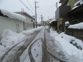 午前は近所のドラッグストアとスーパーで買い物。昼食後、雪すかしをしていたら、近所の方が通りかかり、除雪車が入ると教えてくださいました。午後はいしかわ総合スポーツセンターのプールで歩く。水泳教室が行われていて、20名以上の小学生が2レーンを使って泳いでいました。プールから戻ると、除雪車が入っていました。道路の中央部にたまっていた雪が無くなり、走りやすくなりました。自宅の駐車スペースに入るためには、雪を動かす必要がありましたが、簡単に終了。ただし、夕方から再度雪が降り、白くなっていきました。 | ![]() 除雪車が通った後 |