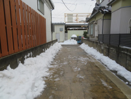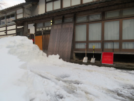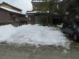 朝5半前に金沢を出て能登に向かう。能登事務所には7時半前に到着。車を止めるスペースを確保すべく、すぐに除雪作業に取り掛かる。とりあえず、車を1台置けるようにしてから、徐々にスペースを広げていく。午前11時ぐらいまでで、1台分のスペースを作り、昼食。午後も作業を続け、3時前で終了。2台分を確保できました。さすがに疲れたので、作業終了。雪すかし作業をしていると良いのは、お向かいの仮設住宅にお住まいの方々と立ち話ができることです。特に仮設住宅に一人でいるとつまらないという方のお話をうかがうことができ、有意義でした。大学生たちにヒアリングしてもらい、まとめていただくと、能登人の暮らしぶりを定着できるのではないかと感じました。能海山市場とスーパーしんやで買い物をして戻り、早めに夕食。お風呂にも早めに入り、早く寝ます。 | ![]() 能登事務所の駐車スペース |